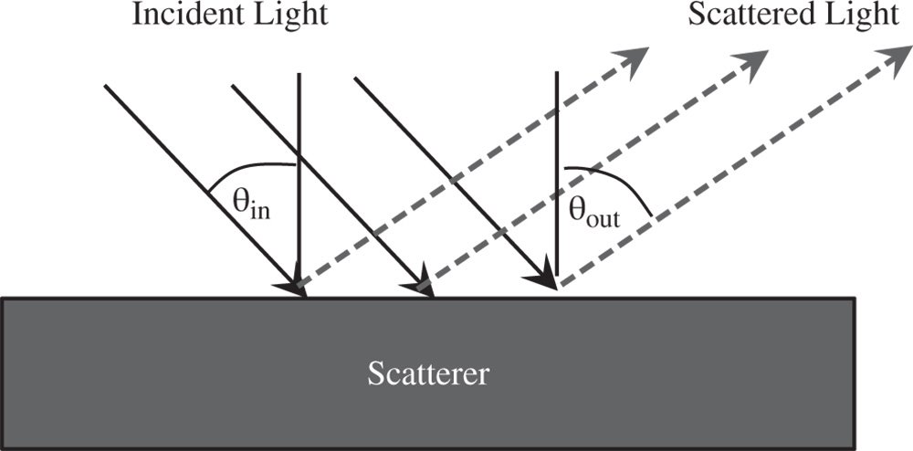 Light that is incident upon a surface is described by its irradiance and its incident angle, θin, as depicted in Figure 7.8. The scattered light is described by its radiance and its output polar angle, θout. Significantly, since the incident light breaks the symmetry of the scattering surface about the normal, the azimuthal angle, φ, of the scattered light also needs to be described. The BRDF is simply the derivative of the output radiance with respect to the input irradiance.