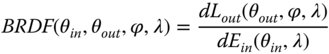 Naturally, the BRDF is a function of wavelength, so the input irradiance might be defined as E(θin, λ) and the output radiance as E(θout, φ, λ). In this case, the BRDF is given by: