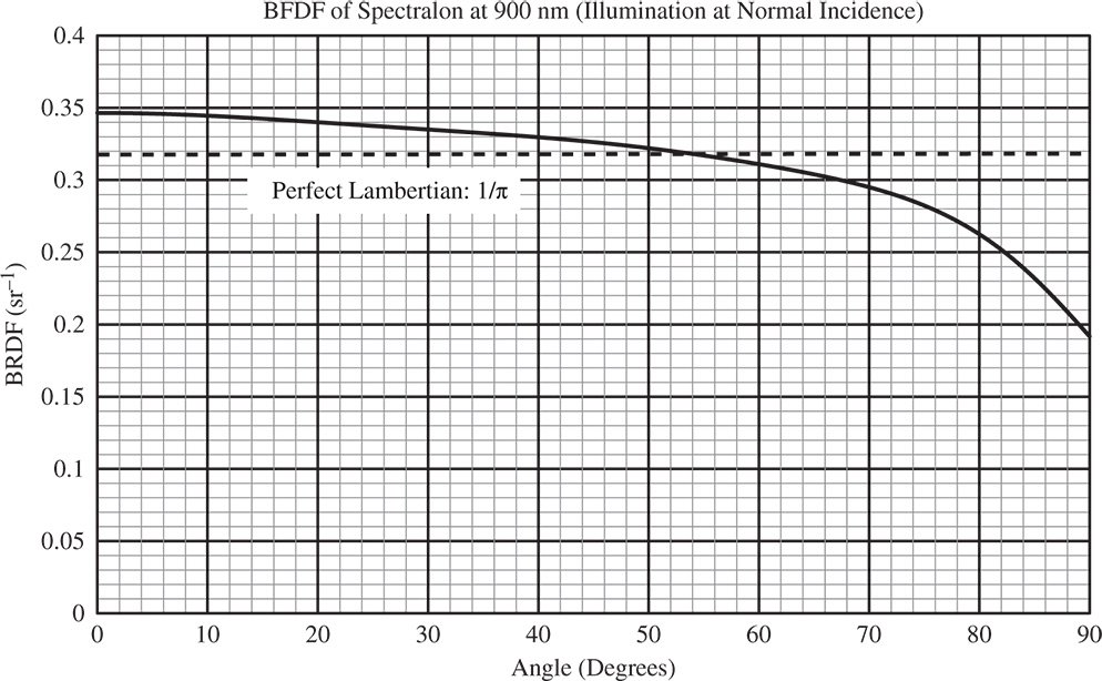 An example of the BRDF of a real material, Spectralon®, is shown in Figure 7.9. The data is for a wavelength of 900 nm and normal incidence, i.e. θin = 0. Spectralon, is based upon sintered polytetrafluoroethylene (PTFE) and represents the closest approximation to an ideal scatterer of any material. Even so, there is a tendency for the BRDF to decline with increasing polar angle.