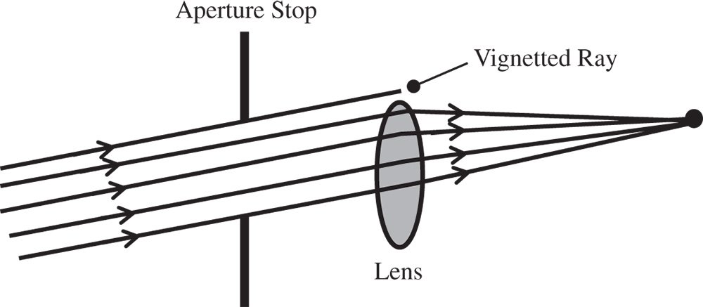 The aperture stop is the principal means for controlling the passage of rays through an optical system. Ideally, this would be the only component that controls the admission of light to the optical system. In practice, other optical surfaces located away from the aperture stop may also have an impact on the admission of light into the system. This is because these optical components, for reasons of economy and other optical design factors, have a finite aperture. As a consequence, some rays, particularly those for larger field angles, may miss the lens or component aperture altogether. So, in this case, for field positions furthest from the optical axis, some of the rays will be clipped. This process is known as vignetting. This is shown in Figure 2.5.