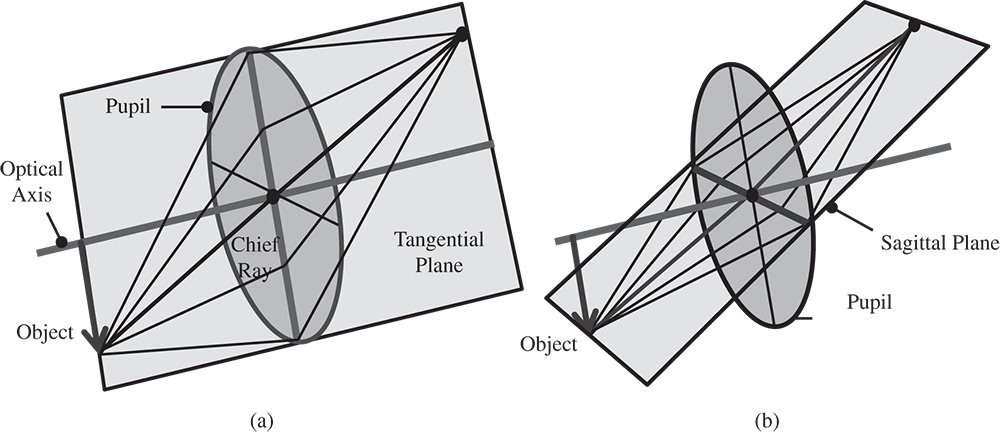 The analysis pursued hitherto has considered the propagation of rays in a single plane. From an analytical perspective, for ray tracing in an ideal system and determining the cardinal points of that system, this is a perfectly acceptable approach. However, in reality, rays are not necessarily confined to the plane containing the object and the optical axis. With the selection of rays delineated by a two-dimensional, circular aperture, we must expect some rays to be out of this plane. A group of co-planar rays, emanating from a single object point and bounded by the entrance pupil is referred to as a ray fan. A ray fan that lies in the plane defined by the object and optical axis is known as the tangential ray fan. The sagittal ray fan emanates from the same object point and lies in a plane that is perpendicular to that of the tangential ray fan. This is illustrated in Figure 2.6.