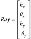 The introduction of two distinct sets of ray fans, tangential and sagittal, together with the inclusion of skew rays confirms that sequential ray propagation in an axial geometry is essentially a two-dimensional problem. Hitherto, all discussion and, in particular, the matrix analysis, has been presented in a strictly one-dimensional form. However, the strict description of a ray in two dimensions requires the definition of four parameters, two spatial and two angular. In this more complete description, a ray vector would be written as:
