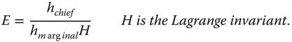 If we now simply evaluate H at the entrance and exit pupils where, by definition, hchief is zero, then the product nhmarginalθchief is constant. The Lagrange invariant then simply articulates the fact that the angular and lateral magnifications are inversely related. In fact, the Lagrange invariant captures a more fundamental constraint to an optical system. If the object plane is uniformly illuminated, then the total light flux emanating from the plane is proportional to the square of the maximum field angle. The proportion of that flux that is admitted by the entrance pupil is itself proportional to the square of the marginal ray height. Therefore, the total flux passing through an optical system is proportional to the square of the Lagrange invariant, H2. Thus the Lagrange invariant is an expression of the conservation of energy as light propagates through an optical system. This will become of paramount significance when, in later chapters, we consider source brightness or radiance and the impact of the optical system on optical flux flowing through it.