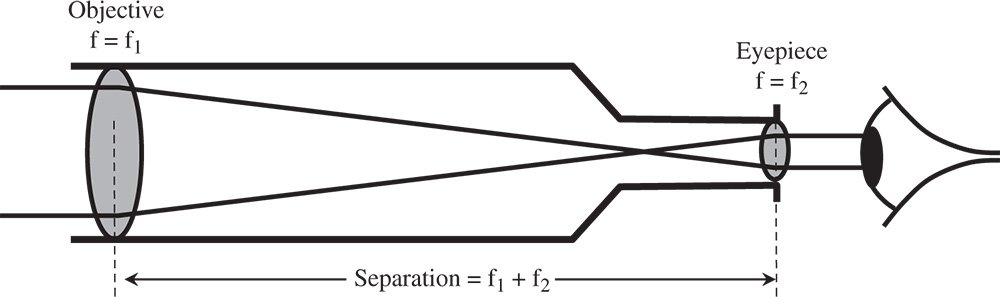 The basic layout of a simple telescope is shown in Figure 2.9. Light from the distant object is collected by an objective lens whose focal length is f1 and then collimated by an eyepiece with a focal length of f2. These two lenses are separated by the sum of their focal lengths, thus creating an afocal system with an angular magnification given by the ratio of the lens focal lengths.