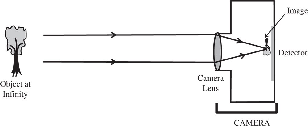 Optically from a paraxial perspective, the camera is an exceptionally simple instrument. Its purpose is simply to image light from an object located at the infinite conjugate onto the focal plane, where the sensor is located. As such, from a system perspective one might regard the camera as a single lens with the sensor located at the second focal point. This is illustrated in Figure 2.10.