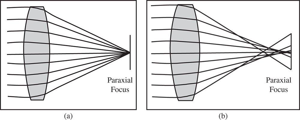 In the first two chapters, we have been primarily concerned with an idealised representation of geometrical optics involving perfect or Gaussian imaging. This treatment relies upon the paraxial approximation where all rays present a negligible angle with respect to the optical axis. In this situation, all primary optical ray behaviour, such as refraction, reflection, and beam propagation, can be represented in terms of a series of linear relationships involving ray heights and angles. The inevitable consequence of this paraxial approximation and the resultant linear algebra is apparently perfect image formation. However, for significant ray angles, this approximation breaks down and imperfect image formation, or aberration, results. That is to say, a bundle of rays emanating from a single point in object space does not uniquely converge on a single point in image space.