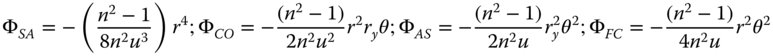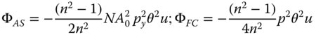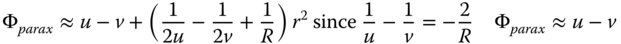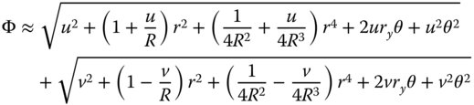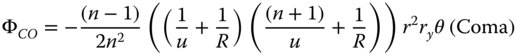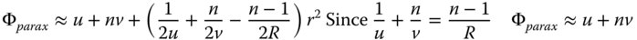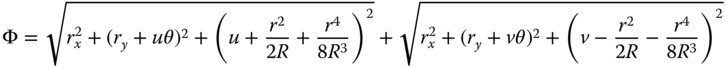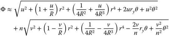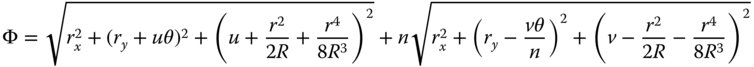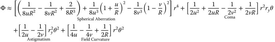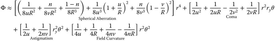 The two square root terms represent the optical path of two ‘legs’ of the journey, with the path through the glass adding a multiplicative factor of n. The next stage of the process is an extension of the paraxial theory. It is assumed that rx, ry, and uθ are all significantly less than u. We can now approximate Φ from Eq. (4.2) using the binomial theorem. In the meantime collecting terms we get: