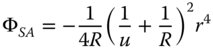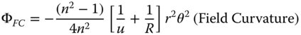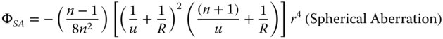 Four of the five Gauss-Seidel terms are present – spherical aberration, coma, astigmatism, and field curvature. However, clearly there is no distortion. In fact, as will be seen later, distortion can only occur where the stop is not at the surface as it is here. Of course, Eq. (4.4) can be simplified if one considers that u, v, and R are dependent variables, as related in Eq. (4.3). Substituting v for u, and R, we can express the OPD in terms of u and R alone. Furthermore, it is useful, at this stage to split the OPD contributions in Eq. (4.4) into Spherical Aberration (SA), Coma (CO), Astigmatism (AS), and Field Curvature (FC). With a little algebraic manipulation this gives: