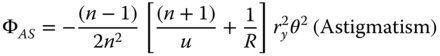 Unlike spherical aberration and coma, there is less scope for correction of astigmatism and field curvature. In Eqs. (4.5c) and (4.5d), astigmatism is corrected at the aplanatic point and field curvature at the radial points. However, the convention used in Eq. (4.5c) to describe astigmatic correction corresponds to zero sagittal ray defocus. On the other hand, using the alternative convention set out in Chapter 3 we have: