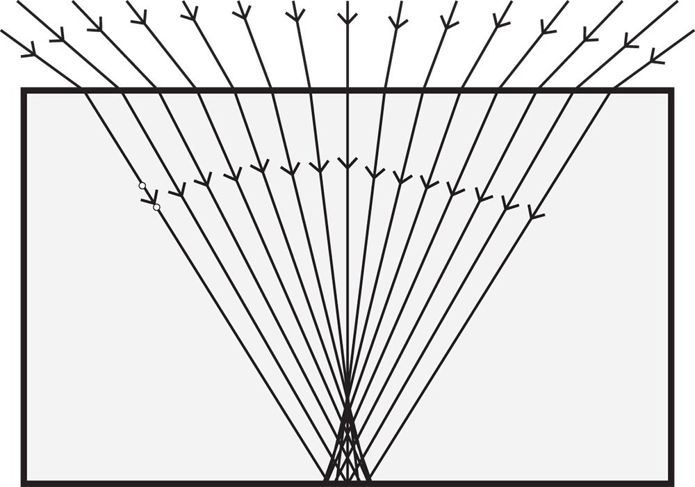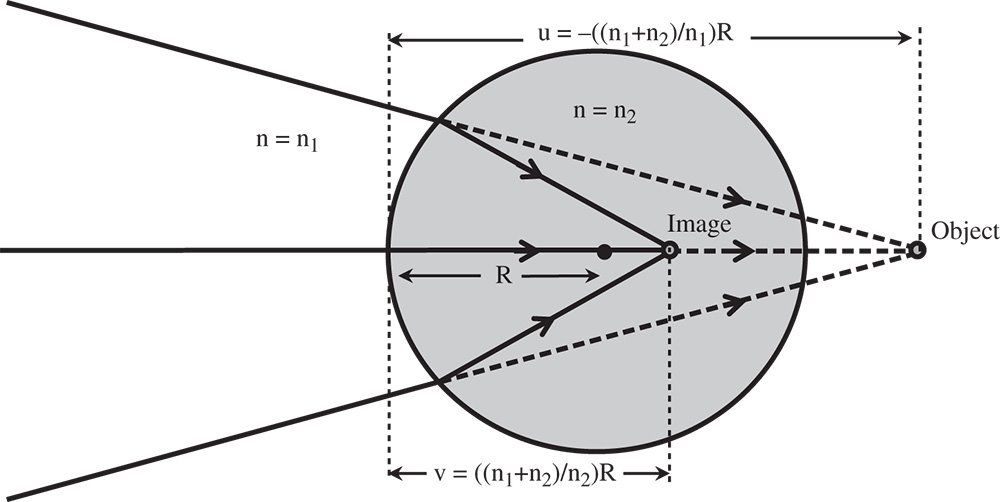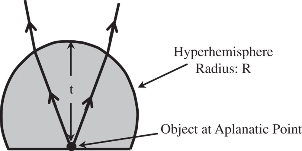 The ‘front end’ of many high power microscope objectives exploits the principle of single surface aplanatic points through the use of a hyperhemisphere co-located with the object. The hyperhemisphere consists of a sphere that has been truncated at one of the aplanatic points which also coincides with the object location, as illustrated in Figure 4.3.