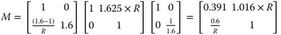 For a tube length of 200 mm, a ×20 magnification corresponds to an objective focal length of 10 mm. As two thirds of the power resides in the hyperhemisphere, then the focal length of the hyperhemisphere must be 15 mm. Inspecting Figure 4.2, it is clear that the thickness of the hyperhemisphere is −R × (n + 1)/n, or −1.625 × R. To calculate the value of R, we set up a matrix for the system. The first matrix corresponds to refraction at the planar air/glass boundary, the second to translation to the spherical surface and the final matrix to the refraction at that surface. On this occasion, translation to the original reference is not included.