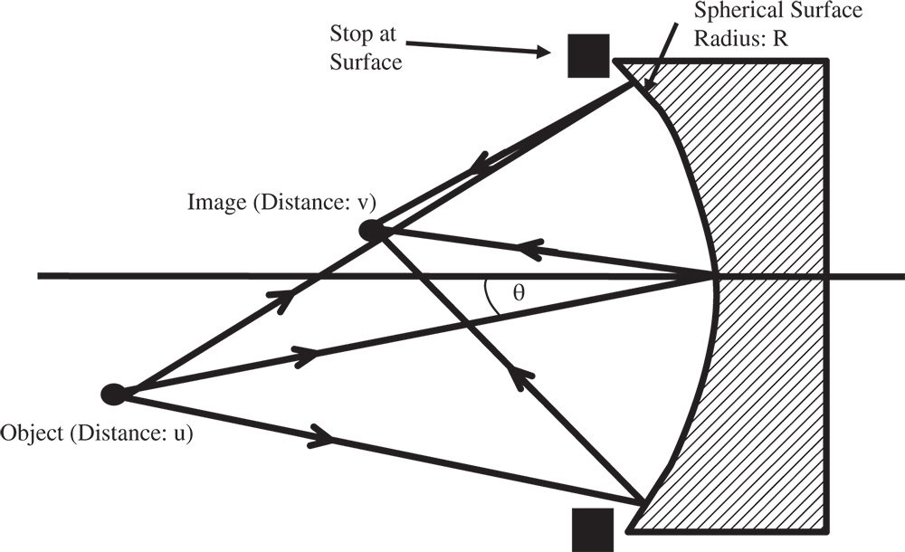 In concentrating on third order aberrations, we shall, in the remainder of this chapter, seek to determine the impact of refractive surfaces, mirrors, and lenses on all the Gauss-Seidel aberrations. This analysis will proceed, initially, on the assumption that the surface in question lies at the pupil position. Subsequently, the impact of changing the position of the stop will be analysed. Manipulation of the stop position is an important variable in the optimisation of an optical design. The concept of the aplanatic geometry will be introduced where specific, simple optical geometries may be devised that are wholly free from either spherical aberration (SA) or coma (CO). These aplanatic building blocks feature in many practical designs and are significant because, in many instruments, such as telescopes and microscopes, there is a tendency for spherical aberration and coma to dominate the other aberrations. The elimination of spherical aberration and coma is thus a priority. Furthermore, by the same token, astigmatism (AS) and field curvature (FC) are more difficult to control. In particular, the control of field curvature is fundamentally limited by Petzval curvature, as alluded to in the previous chapter.