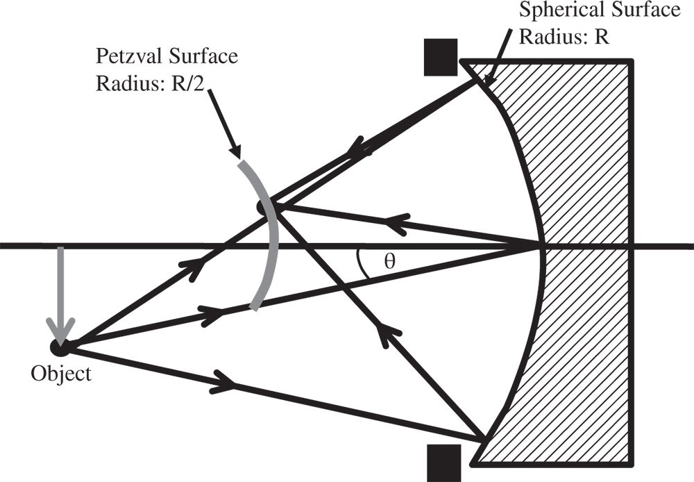 In this instance, the Petzval surface has the same sense as that of the mirror itself. However, the radius of the Petzval surface is actually half that of the original surface. This is illustrated in Figure 4.6.