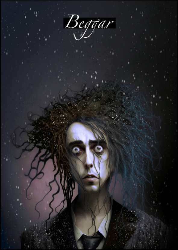 The thin and fragile silhouette of the Beggar is caught by the blizzard and carried away in an unknown direction.