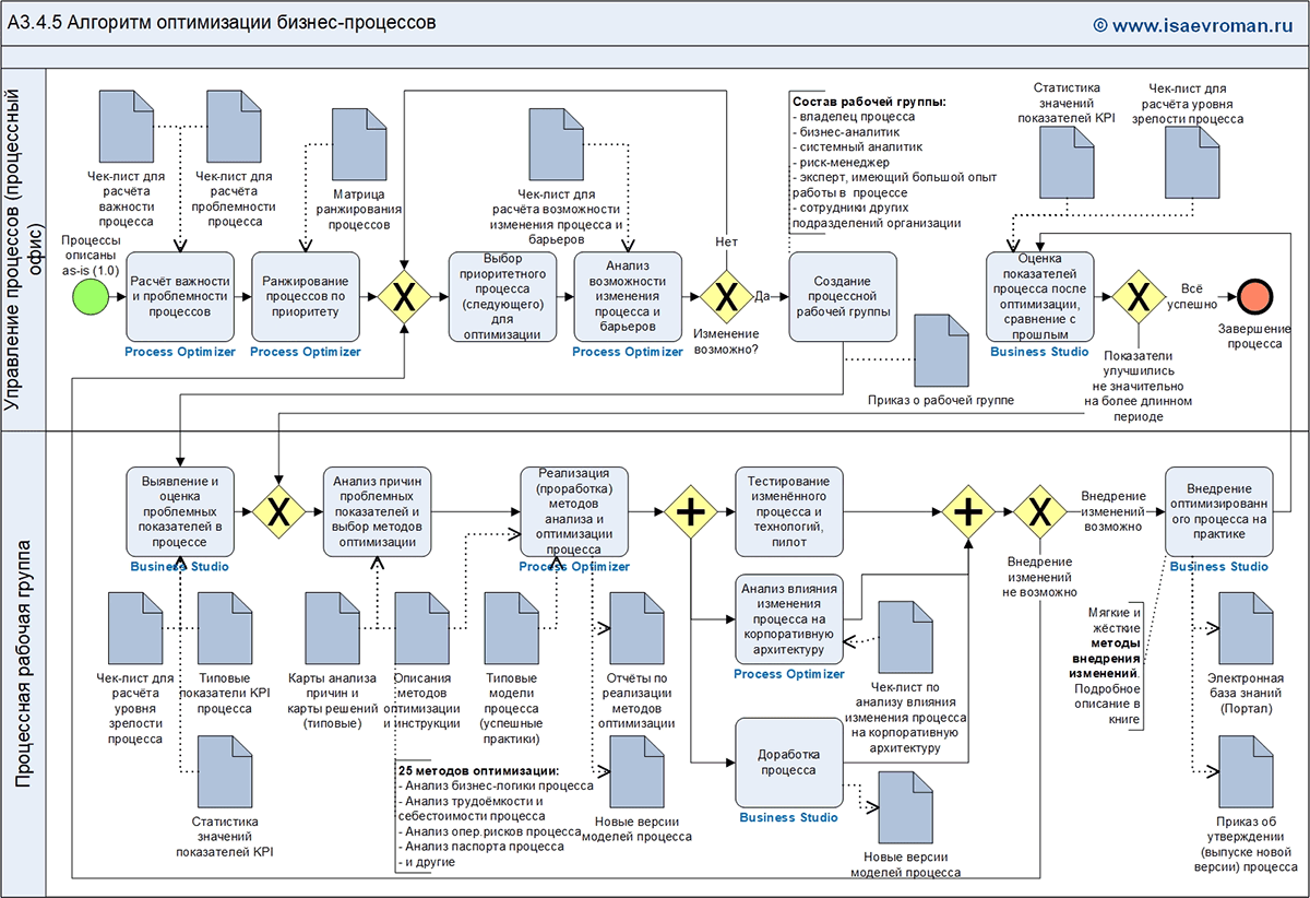 Подразумевается, что процессы в организации уже описаны графически и структурированы, есть как минимум версии 1.0 (as-is). Далее рассмотрим последовательность задач алгоритма оптимизации.