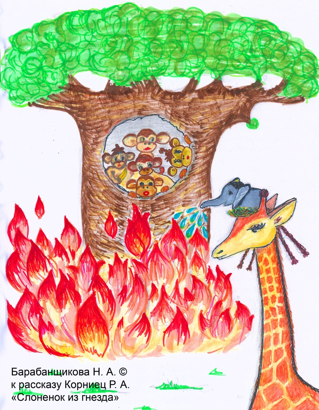 Жираф в мгновенье ока подпрыгнул и пустился по направлению к красному зареву. Слоненок покрепче вцепился хоботом за палочки гнезда. Он то и дело подпрыгивал, пока жираф мчался галопом. И едва не вылетал из гнезда. И вот уже виднелось дерево.