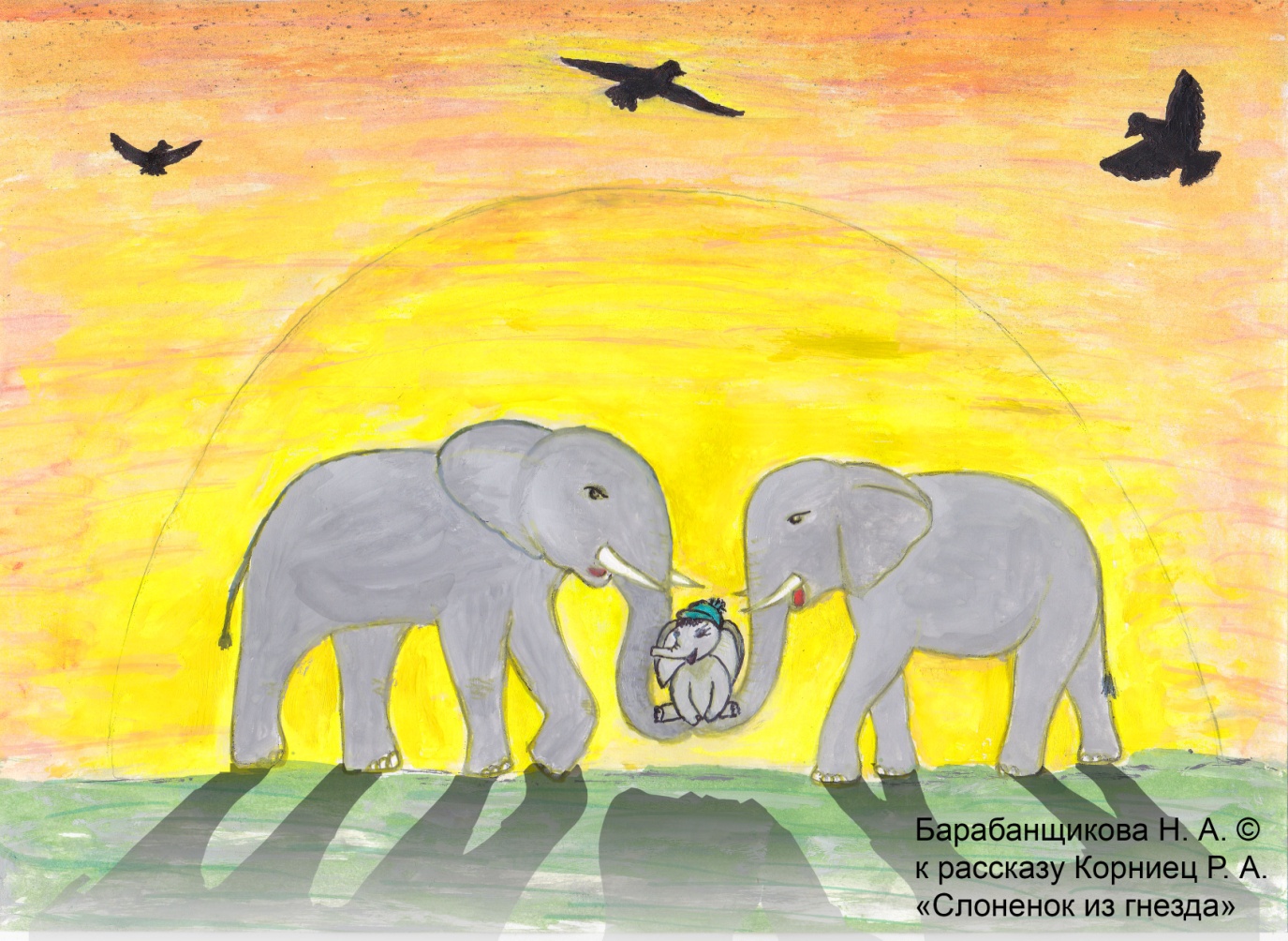 Папа и мама обняли его. Поблагодарили жирафа. А жираф, в свою очередь, рассказал о смелом слоненке. Малыш и родители попрощались с жирафом. Папа, мама и слоненок отправились в путь, домой. Туда, где восходит солнце.