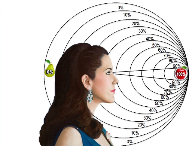 Так и есть! Ведь для резонирования вниманию нужна опора – слово-мелодика (предмет речи) ума. Нет чувствования опоры – нет и внимания! Внимание теряется в пустоте, которая не может быть основой резонанса. Ведь любое не слово (что-то иное, неважно что!), на котором фокусируется заикающийся в момент речи, является лишь не резонируемой (не отражаемой) пустотой. Говоря в одиночестве или в привычной обстановке, такому спикеру просто не на кого и не на что смещать центр своей сенсорики от собственного слова. Поэтому он говорит, сенсоря естественным образом свои слова в уме и естественно отражая (резонируя) их своим речевым аппаратом. Но при появлении раздражителей, заикающийся тут же переводит на них центр сенсорики, и оставляет чувствование слова в различной степени размытости (неточности, пустотности, диссонанса) … словно то яблоко на иллюстрации, всё более удаляющееся от 100%го центра к слепой зоне за головой.