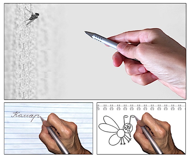 Посмотрите, как ес-тественно я использовала ручку в качестве указки на первой фотогра-фии. Направив её острием на выбранный объект (сидящего на стене комара), я указала на объект для наблюдения, замера, сканирования умом (отражения и забо-ра информации в памяти). Ручка в данном случае де-монстрирует модель использования природного луча внимания-мерила человеком, оперирующего своей машиной «тело-ум» в режиме сканера. Но в следующий момент, на двух фотографиях внизу, вы видите, как я превратила эту же самую ручку-указку в совершенно другой инструмент – инструмент отдачи информации из памяти. Я использую её тот же острый конец в качестве проектора! Причём, как видите, проецировать ею информацию о предмете речи (о комаре) можно в различных вариантах: можно слово-символику написать, а можно, нарисовать картинку-образ.