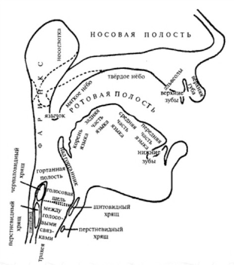Надо отметить, что современные языковеды весьма преуспели в детальном описании анатомического строения речевого аппарата человека. Благодаря современным технологиям, учёные сумели заметить и отобразить мельчайшие подробности его строения на всевозможных схемах, подобным представленной ниже36.