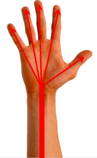 Широкая красная линия обозначает единую силу воли, которую мы вкладываем в руку, а расходящиеся узенькие стрелки указывают на сепарацию (разделение) этой энергии (электричество).