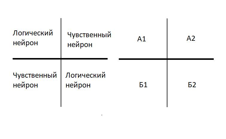 Вот мы и познакомились с базовой моделью формирования опыта на основе которой формируется наше мышление. Получается, что при возбуждении нейрона происходит обратная реакция, сформировавшая этот нейрон. При возбуждении логического нейрона происходит соответственное сокращение мышц в противоположной части тела. При возбуждении чувственного нейрона происходит соответственная электромагнитная напряжённость клеточных рецепторов сформировавшая данный нейрон. Таким образом возбуждение нейронов формирует простое поведение на основе базовых реакций условного и безусловного типа.