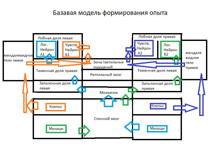 Базовая модель формирования опыт дает на возможность создавать нейроны. Возбуждение нейронов приводит к сложной модели поведения обрабатываемой зоной тактильных ощущений с миндалевидными телами и рептильным мозгом. Отношение между логическими нейронами формируется по средствам подсознания, которое также анализирует и фильтрует электрическую напряжённость сигналов от веток нервной системы. Сознание использует правое полушарие для контроля сложного поведения при помощи возбуждения чувственно-логических последовательностей нейронов своего полушария и анализирует по средствам логико-чувственных последовательностей левым полушарием. Сверх сознания контролирует сложное поведение по средствам возбуждения обратного сознательному, то есть при помощи контроля левого полушария по средствам чувственно-логических нейронных последовательностей и контроля правого полушарий по средствам логико-чувственных последовательностей нейронных возбуждения. Таким образом устроена наша психика относительно последовательности формирования психических цепочек в результате эволюции.