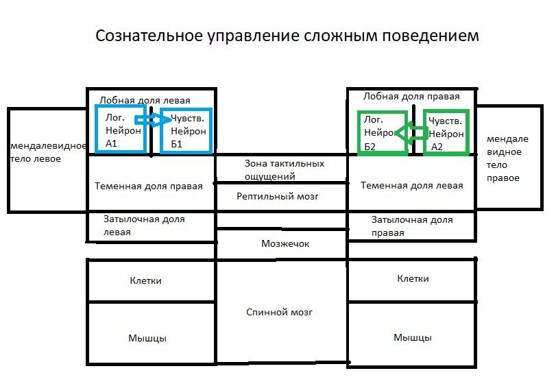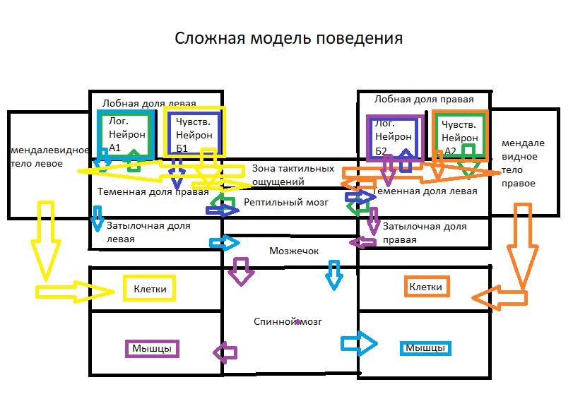 Сложное поведение формируется относительно отношения нейронов друг к другу используя базы данных реакций. Под базами данных подразумеваются рептильный мозг и зона тактильных ощущений формирующие эмоции и инстинктивное поведение. Рептильный мозг обрабатывает сигнал от чувственных нейронов полушарий сопоставляя их с логическими нейронами противоположного полушария относительно полушария, возбудившего нейрон. Сопоставление с логическим нейроном противоположного полушария происходит посредствам вызванного чувственным нейрон при помощи базы данных рептильного мозга инстинктивного поведения. Инстинктивное поведение вызывает соответственные базе данных рептильного мозга мышечные реакции, которые мы уже сопоставляем с нашим логическим опытом. Либо формируя новый нейрон опыта с чувственно логической относительностью разных полушарий. Либо возбуждаем чувственно логическое понимание уже имеющегося опыта при сравнении мышечной реакции вызванной инстинктивным поведением с логической базой данных противоположного полушария возбудившего чувственный нейрон. Зона тактильных ощущений в совместной работе с миндалевидными телами формирует эмоции. В базовой модели формирования опыта клеточная напряжённость формирует чувственные нейроны в своей половине тела. А при возбуждении чувственного нейрона создаётся эмоция и соответственное этой эмоции инстинктивное поведение в виде мышечной реакции. Следовательно, при возбуждении логических нейронов происходит обратный процесс, и вызванная логическим нейроном мышечная реакция формирует при помощи миндалевидных тел и зоны тактильных ощущений электромагнитное напряжение клеточных рецепторов создавая эмоциональный фон своей половины тело относительно базовой модели и противоположно относительно возбуждённых мышц. Которые при возбуждении создают относительно возбуждений с противоположной стороны возбудившего мышечную реакцию логического нейрона клеточную напряжённость. Тем самым дублируя эмоциональный фон на вторую половину тела. Исходя из этого благодаря рептильному мозгу, мы можем сопоставлять чувственные нейроны одного полушария с логическими другого. А благодаря зоне тактильных ощущений сопоставлять чувственные нейроны одного полушария с чувственными нейронами другого. При этом базовая модель дает возможность формировать логические и чувственные нейроны обоих полушарий и сопоставлять логические нейроны одного полушария в отношении чувственных неровно другого полушария.