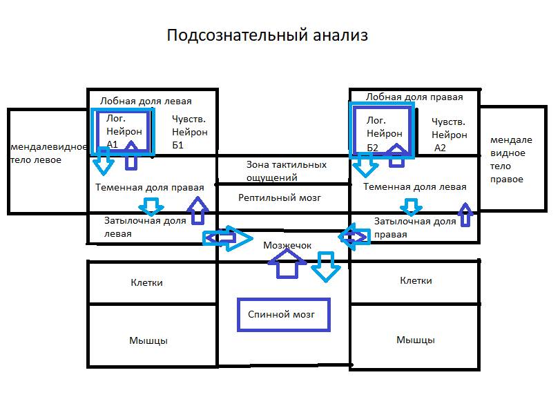 Как мы знаем правое полушарие управляет левой половиной тела, а левое полушарие правой половиной. Согласно первой цепочки сигнал от мозжечка передается в затылочную долю, которая создает объёмность сигнал от мозжечка. Также как создает объёмность сигнала от глаза. Создание объемности сигнала от мозжечка – это косвенная задача затылочной доли. Далее сигнал от затылочной доли поступает в теменную. Теменная доля дает возможность ощутить данный сигнал в том виде в котором мы его ощущаем. При неоднократных повторениях сигнал от мышц создает повторение ощущений в теменные доли, которая относительно данного сигнала от мышц создает логический нейрон. Получается, что реакция от мышц с лева создает при неоднократных повторениях логический нейрон с права, а реакция от мышц справа создает логический нейрон с лева. Вторая цепочка при помощи зоны тактильных ощущений создает объемность сигналов, считанных миндалевидными телами с клеточных рецепторов. И передает сигнал в теменную долю. Теменная доля дает возможность нам ощущать сигналы от клеток сформированные зоной тактичных осушений и миндалевидными телами. При неоднократных повторениях одинаковых возбуждений клеточных рецепторов с права формируется чувственный нейрон с права, а при повторении возбуждения клеточных рецепторов слева формируется чувственный нейрон с лева. Таким образом первая цепочка формирует логический опыт (нейроны), а вторая формирует чувственный опыт (нейроны).