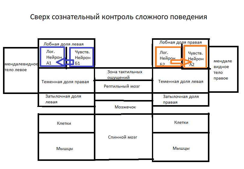 Сложное поведение отрывает возможно управления организмом по средствам психических процессов подсознания, сознания и сверх сознания. Эмоциональный фон открывает возможность подсознанию анализировать происходящее с организмом меняя напряжённость нервной системы. Напряжённость нервной системы анализирует подсознание, тем самым формируя первую психическую цепочку до уровня психического процесса которая выглядит следующим образом: безусловная реакция – условная реакция – логический нейрон – эмоциональный фон – подсознательное мышление. За подсознательное мышление отвечает спинной мозг. Именно спиной мозг анализирует поведение и состояние внутренних элементов по средствам нервной системы и производит вычисления и решения исходя из иммунной базы данных. Помимо этого, спиной мозг может сопоставлять логические нейроны разных полушарий так, как участвует в непосредственном их формировании согласно базовой модели и предает сигналы от мышц посредствам нервной системы в мозжечок. Следовательно, благодаря спинному мозгу мы имеем возможность анализировать информацию. Разные полушария отвечают за разное отношение к внешней и внутренней среде. Левое полушарие отвечает за отношение внутренней среде, а правое за отношение к внешней. При доминировании правого полушария на левым формируется сознательное мышление определяющее отношение внешней среды к внутренней формируя Я. Я или же сознание управляет организмом по средствам возбуждения чувственных нейронов правого полушария, которые сопоставляются при помощи сознательного мышления с логическими нейронами правого полушария. Тем самым формируя чувственную модель управления логическим путем относительно внешних ситуаций. Относительно левого полушария сознательная модель использует схему логический чувственного управления при помощи сложного поведения (рептильного мозга) при этом левое полушарие для сознательной модели управления является подчинённым. И сопоставление логических нейронов левого полушария относительно чувственных нейронов левого полушария происходят только при сознательном анализе. Получается, что сознательные выбор и решения происходит благодаря сознательному контролю правого полушария. А сознательный анализ имеющегося логического опыта для сопоставления с чувственными нейронами происходит благодаря сознательному контролю левого полушария. Сверхсознательное мышление формируется за счёт контроля левого полушария посредствам чувственных нейронов, которые сопоставляются с логическими, давая возможность чувственно вырождаться логическими возбуждениями относительно внутренних ощущений. А также контроль правого полушария по средствам логических возбуждения с сопоставлением с чувственными нейронами правого полушария открывает возможность выражаться логический относительно чувств или чувственного поведения объектов внешней среды.
