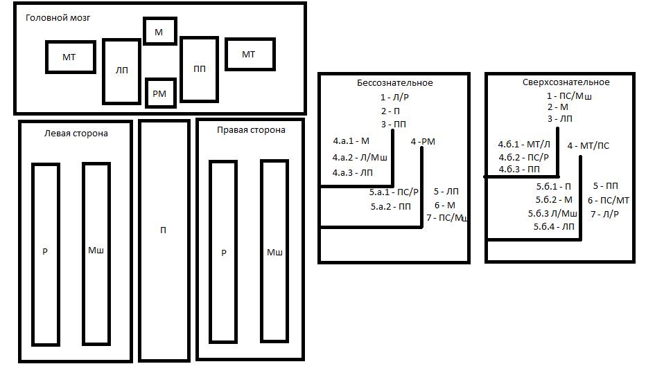 Последовательность информационных потоков бессознательного начинается с (1-Л/Р) рецепторов левой стороны их возбуждение возбуждает нервную систему и передает сигналы через (2-П) позвоночник в (3-ПП) правое полушарие в котором происходит разделение потока возбуждения на две ветки первая ветка возбуждает (4.а.1-М) мозжечок который возбуждает (4.а.2-Л/МШ) мышцы левой стороны, возбуждение которых ощущается (4.а.3-ЛП) левым полушарием как логическая (мышечная) причина рецепторного возбуждения или другими словами логическое описание, походу это инстинктивное возбуждение которое активирует рептильный мозг, вторая ветка возбуждения возбуждает (4-РМ) рептильный мозг который создаёт еще две ветки потока первая ветка потока от рептильного мозга уходит на (5.а.1-ПС/Р) правую сторону возбуждая рецепторы которые в свою очередь ощущаются (5.а.2-ПП) правым полушарием как результат сознательной деятельности, другое ответвление возбуждает нейроны (5-ЛП) левого полушария которое в сою очередь направляет поток в (6-М) мозжечок, который возбуждает (7-ПС/МШ) мышцы правой стороны что является результатом бессознательного психического процесса.