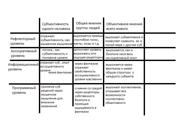 В таблице 13 приведено соотношения субъективности, общего мнения групп и объективности по отношению к психическим уровням. Под субъективностью мы понимаем субъективное мнение одного человека, выраженное через мышечное мышление. Под общим мнением групп людей понимается дополнение субъективного мнения в виде дополнительных ощущений, вытекающих от рецепторного восприятия. Под объективным мнением всего живого понимается коллективное выражение относящаяся к каждому уровню или проще говоря коллективно объективное отношение. Давайте теперь разберемся, что подразумевается в соотношении с каждым уровнем.