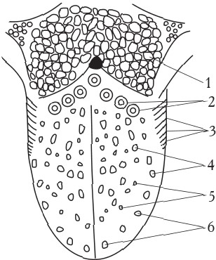 Рисунок 1. Сосочки языка: 1 – язычная миндалина; 2 – желобовидные сосочки; 3 – листовидные сосочки по краю языка; 4 – конические сосочки на спинке языка; 5 – нитевидные сосочки; 6 – грибовидные сосочки по краю языка
