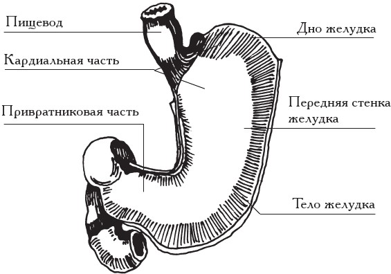В желудке выделяют несколько частей: дно, тело, кардиальную часть, привратниковую часть, переднюю и заднюю стенку, большую и малую кривизну (рис. 2).