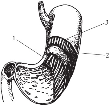 Рисунок 3. Мышечные слои желудка: 1 —косой (внутренний); 2— циркулярный (средний); 3 – продольный (наружный)