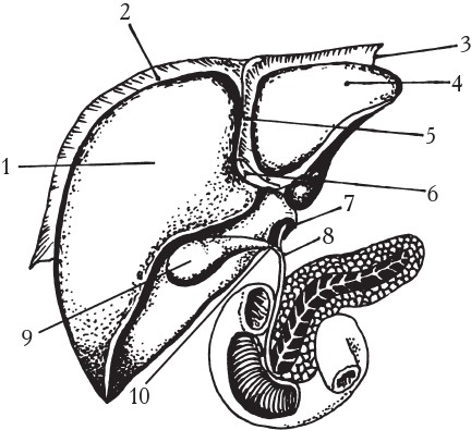 Рисунок 4. Строение печени: 1 – правая доля; 2 – венечная связка; 3 – левая треугольная связка; 4 – левая доля; 5 – серповидная связка; 6 – круглая связка; 7 – общий печеночный проток; 8 – желчный проток; 9 – желчный пузырь; 10 – пузырный проток