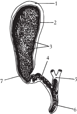 Рисунок 5. Строение желчного пузыря: 1 – дно; 2 – тело; 3 – складки слизистой; 4 – желчный проток; 5 – общий печеночный проток; 6 – общий желчный проток; 7 – шейка