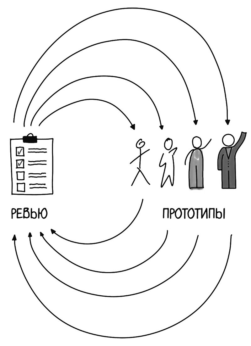В то же время прототип должен быть создан быстро (rapid), чтобы можно было сразу его скорректировать. Итеративная разработка заключается в следующем: необходимо представить идею – легко и быстро испытать ее – получить фидбэк (от коллег и клиентов) – скорректировать на следующем витке – реализовать или отказаться от нее. Таким образом можно создать несколько прототипов, сохранить гибкость в подходе к проекту и недорого развернуться на рынке. (Сравни с «Agile»)