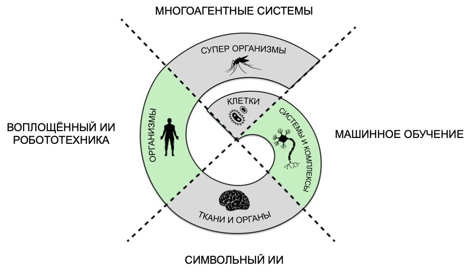 Действительно, клеточный уровень организации жизни может быть смоделирован в рамках теории многоагентных систем, как это уже упоминалось. Все генетические принципы развития жизни и передачи информации из поколения в поколение моделируются в рамках эволюционного подхода к искусственному интеллекту. Вычислительные процессы в естественных нейронных сетях моделируются машинным обучением и искусственными нейронными сетями, которые получили самый мощный заряд развития при получении важных результатов в области глубокого обучения. Логические процессы мышления, супервентные над вычислительными процессами нейронных сетей, нашли своё отражение в символьном подходе искусственного интеллекта. Целостный организм изучается в робототехнике и теории воплощённого искусственного интеллекта, в которой широко применяются гибридные когнитивные архитектуры для решения широкого ряда задач мыслительного характера. И, наконец, на уровне супер-организмов вновь проявляется теория многоагентных систем.