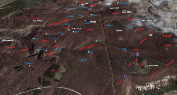 Снимок со спутника участка прорыва с нанесением советских тактических обозначений местности и координатной сеткой, используемой в немецких отчётах.