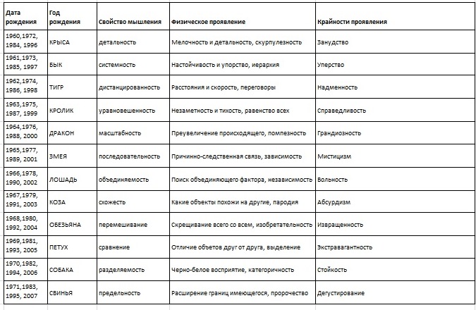 Согласно китайскому гороскопу явления присущие дню рождения человека влияют лишь на его мыслительную функцию, явления присущие месяцу рождения влияют на его коммуникативную функцию, и явления присущие году рождения влияют на его физическую деятельность.