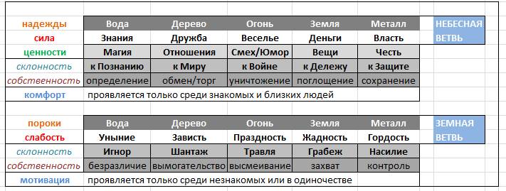 При этом полное отсутствие каких-то стихий говорит о том, что человек абсолютно беспомощен в их силе: 1) отсутствие воды делает человека не любопытным, и не желающим искать знания и деньги, 2) отсутствие дерева делает человека бессердечным, равнодушным к сантиментам, 3) отсутствие огня, делает человека слишком серьезным, избегающим веселья, 4) отсутствие земли, делает человека безразличным к богатству и накопительству, 5) отсутствие металла делает человека безразличным к власти и контролю в отношениях. Боги, то есть сочетание нескольких одинаковых (в данном случае одного цвета) стихий в гороскопе индивида определяются тем, что человек хочет доказать себе или другим; что он достоин получать и сам воспроизводить идеи (вода), веселье (огонь), деньги (земля), власть (метал) и любовь (дерево) для окружающих (в небесной ветви) или для себя (в земной ветви). Это ценности проявляются в доказательной форме, «вот мол смотрите, что я смог», «на что я способен» для небесной ветви, и «я такой какой я есть» для земной ветви. Их силу можно измерять количеством повторяющихся стихий, если например два повтора, то это бог в квадрате, если три повтора, то это бог в кубе. В данном гороскопе, имеются два дерева и две земли, а значит у него в приоритете по жизни дружба в квадрате и богатство в квадрате. В принципе этого даже достаточно, чтобы узнать человека. Ведь как говорили древние: «чтобы узнать человека, просто узнай каким Богам он молится». А это очень легко сделать, зная всего лишь его дату рождения. Однако, это то, чему он молится, видя свой путь наверх, но редко проявляет к этому активные действия.