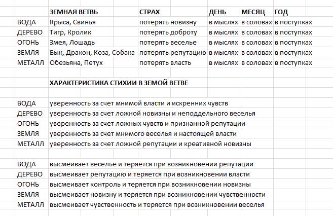 Что касается стихий земной ветви, которая определяет поведение знаков, то они напрямую связаны со страхами человека. К примеру, вода в земной ветви (знаки крысы и свиньи) выражается в убежденности, что все должно течь, в паническом страхе обладателя в потери какого-то знания: если в дне, то в мыслях; если в месяце, то в общении; если в годе, то в поступках. Дерево (знаки тигра и кролика) означает веру в добро и хорошие отношения, а так же страх потерять что-то развивающегося, вроде чувств, таких как дружба и любовь: в мыслях (день), общении (месяц) или поступках (год). Огонь (знаки змея и лошадь) выражается в вере в то, что все привычное должно сгорать, в страх потерять способность изменяться самому, то есть проявлять веселье или юмор в мыслях, общении или поступках. Земля (бык, дракон, коза, собака) выражается в убежденности, что все нужно концентрировать вокруг, в жадности, в страхе потерять накопленное (репутацию, деньги, имущество) в мыслях, общении или поступках. И металл (обезьяна и петух) вырежется в убежденности, что все нужно замораживать, увековечивать, стабилизировать, в страх потерять уже застывшее или привычный контроль: над мыслями (в дне), над речью в общении (в месяце), или поступками (в годе).