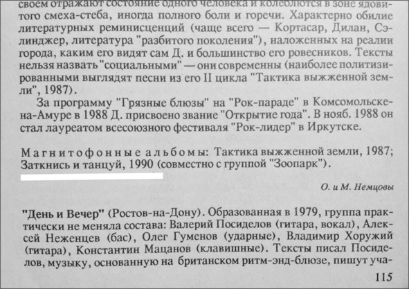Да, я знаю, что название не бог весть какое оригинальное. Песни Shut Up And Dance есть в репертуаре групп Aerosmith, Walk The Moon, Fiddler’s Green. У некоторых российских команд найдутся подобные треки (например, у группы Дайте Два есть более развернутое пожелание – Заткнись, пей и танцуй). А еще так называется один из эпизодов британского сериала Черное зеркало. Но я ответственно заявляю, что эту хлесткую фразу я впервые приметил еще в начале девяностых в альманахе Рок-музыка в СССР в дискографии Александра Дёмина. Доказательство прилагается ниже.