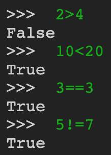 When we compare numbers to each other, we usually use the symbols like > (greater), < (less), = (equal), and so on. They work in Python too. And here's how they look: