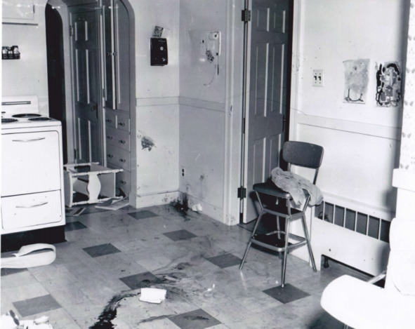 Трубка телефона была вырвана из стены и помещена в корзину для мусора. Телефонная книга была открыта в разделе номеров экстренных служб. Небольшой кухонный столик был перевернут.