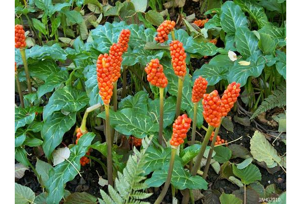 Цвет: Корень – коричневый; листья, стебли – темно-зеленые; плоды – красные; цветки – белые