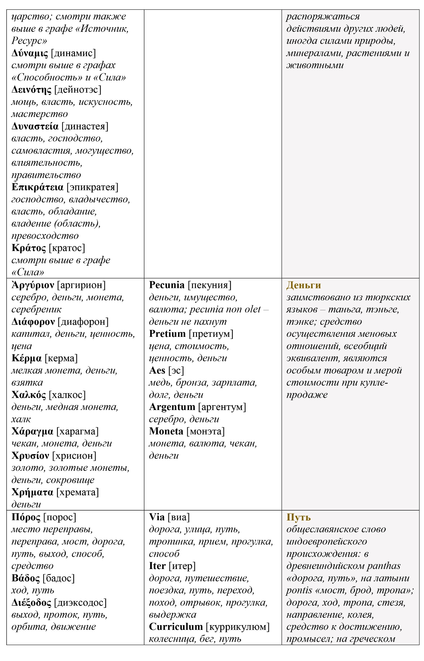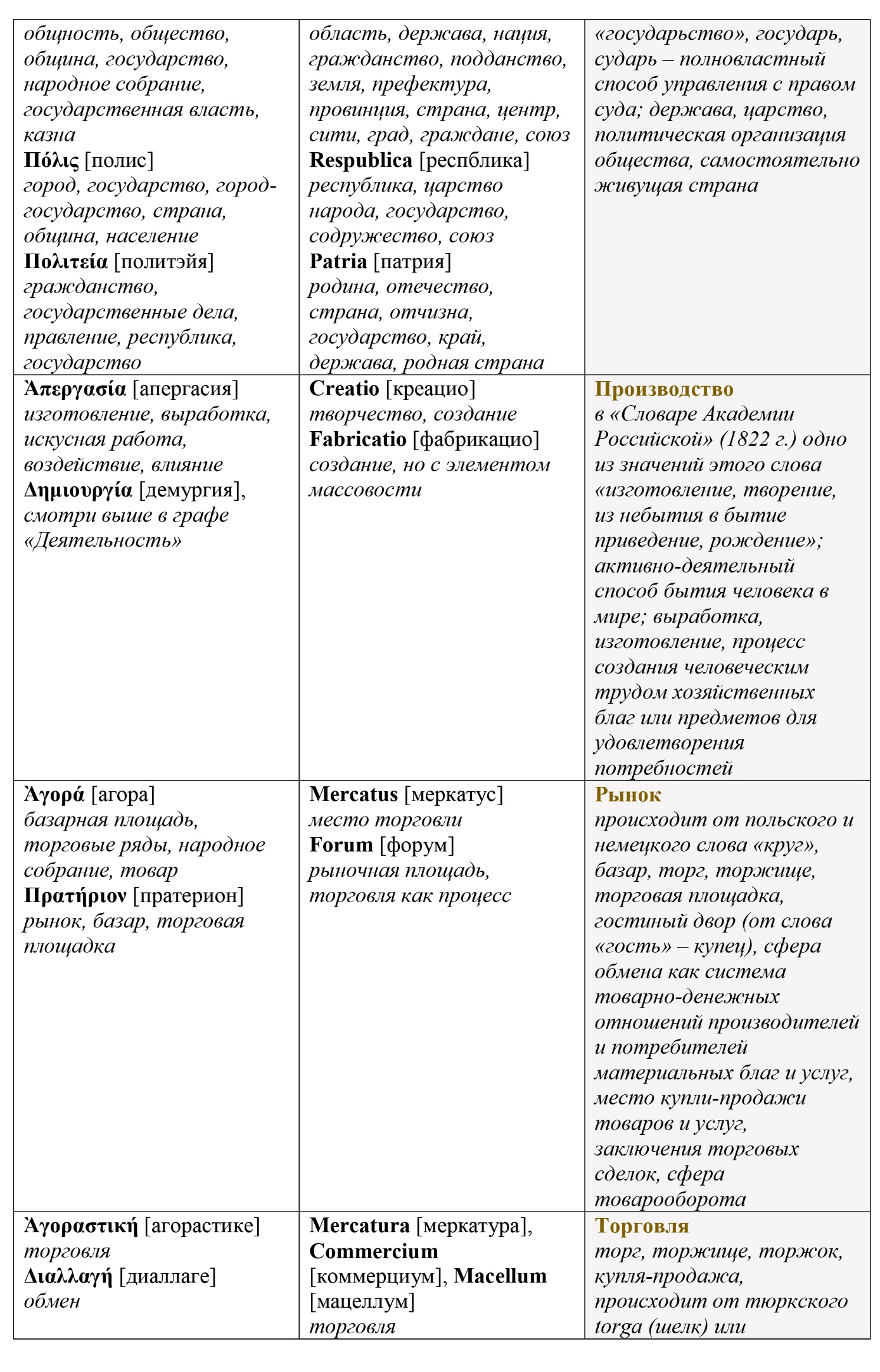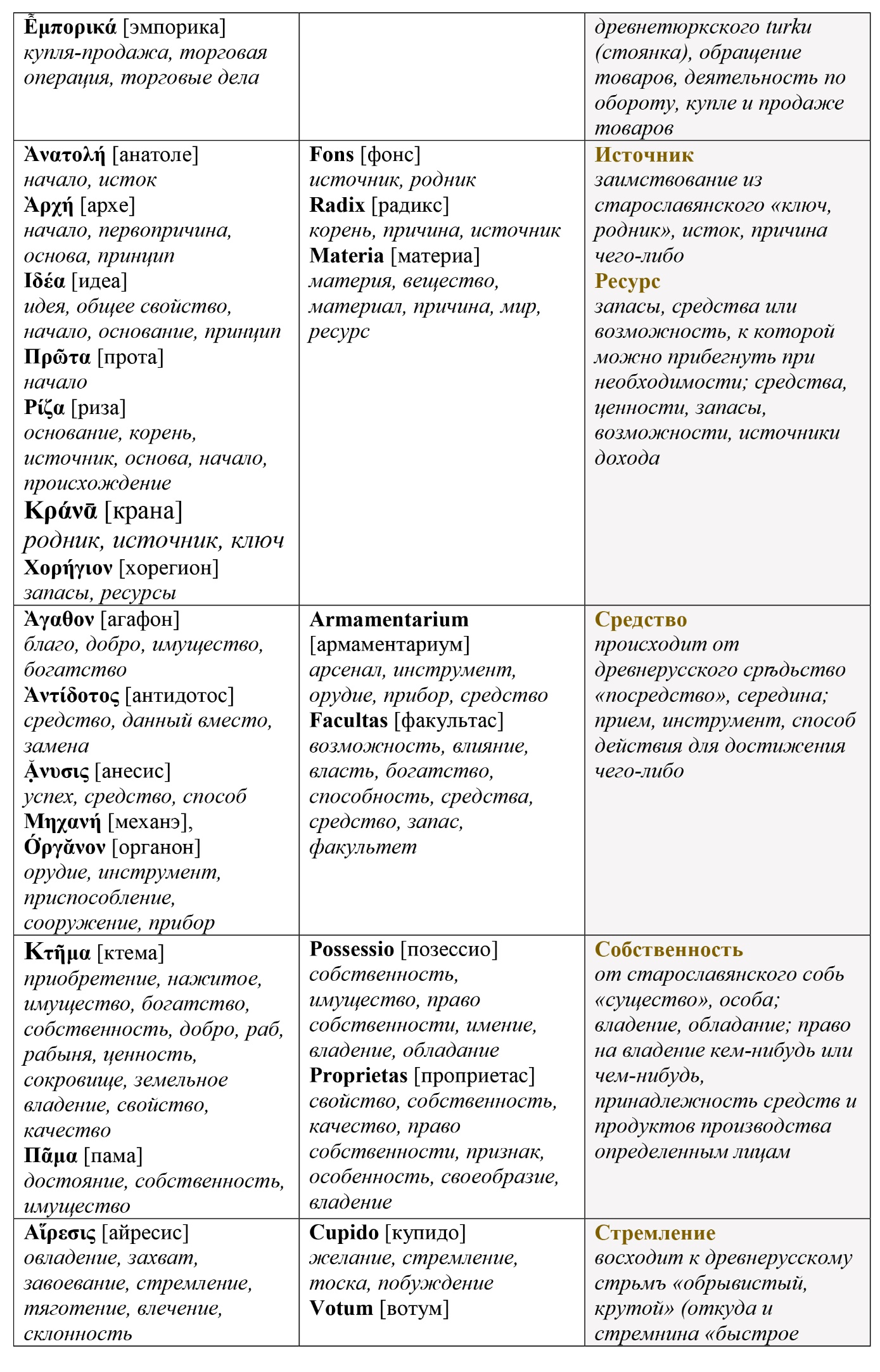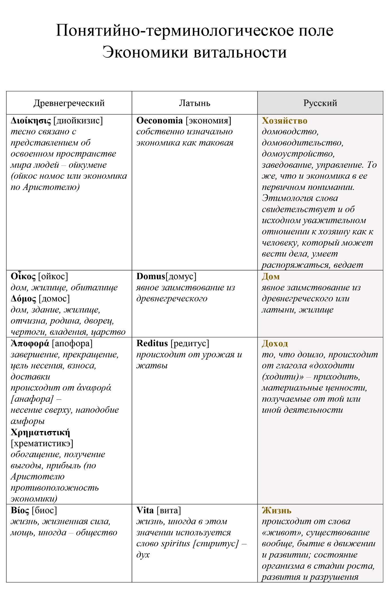 Представленная таблица не претендует на полноту, однако в любом случае, она полезна для медитативных размышлений на тему экономики и хозяйства, поскольку своими реперными точками довольно полно очерчивает понятийно-проблемное пространство.