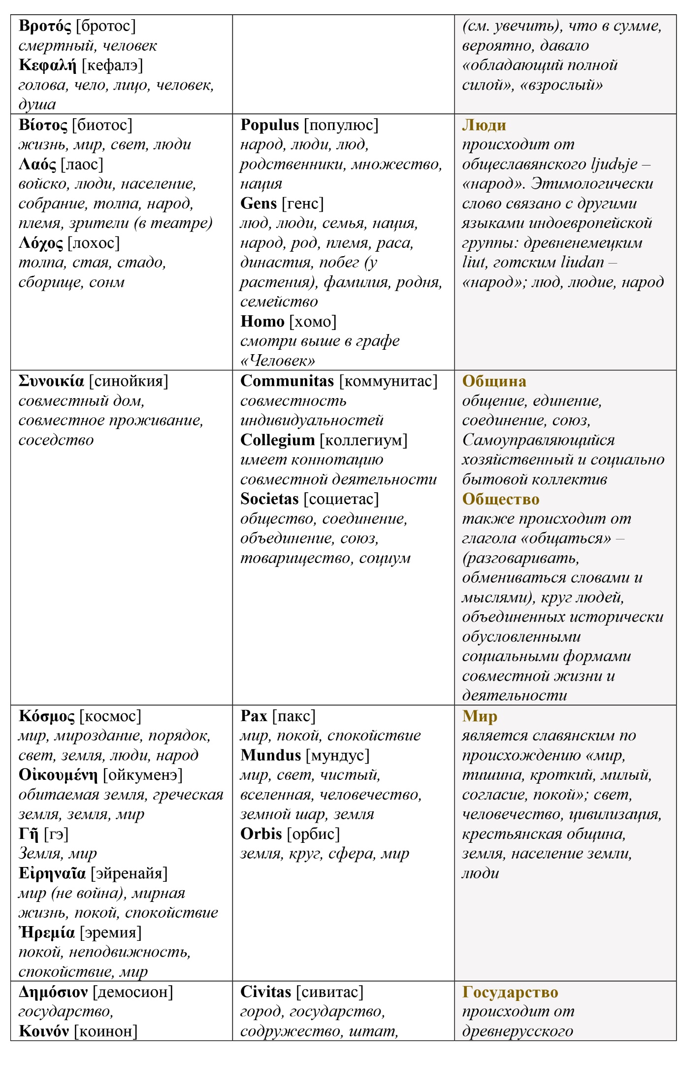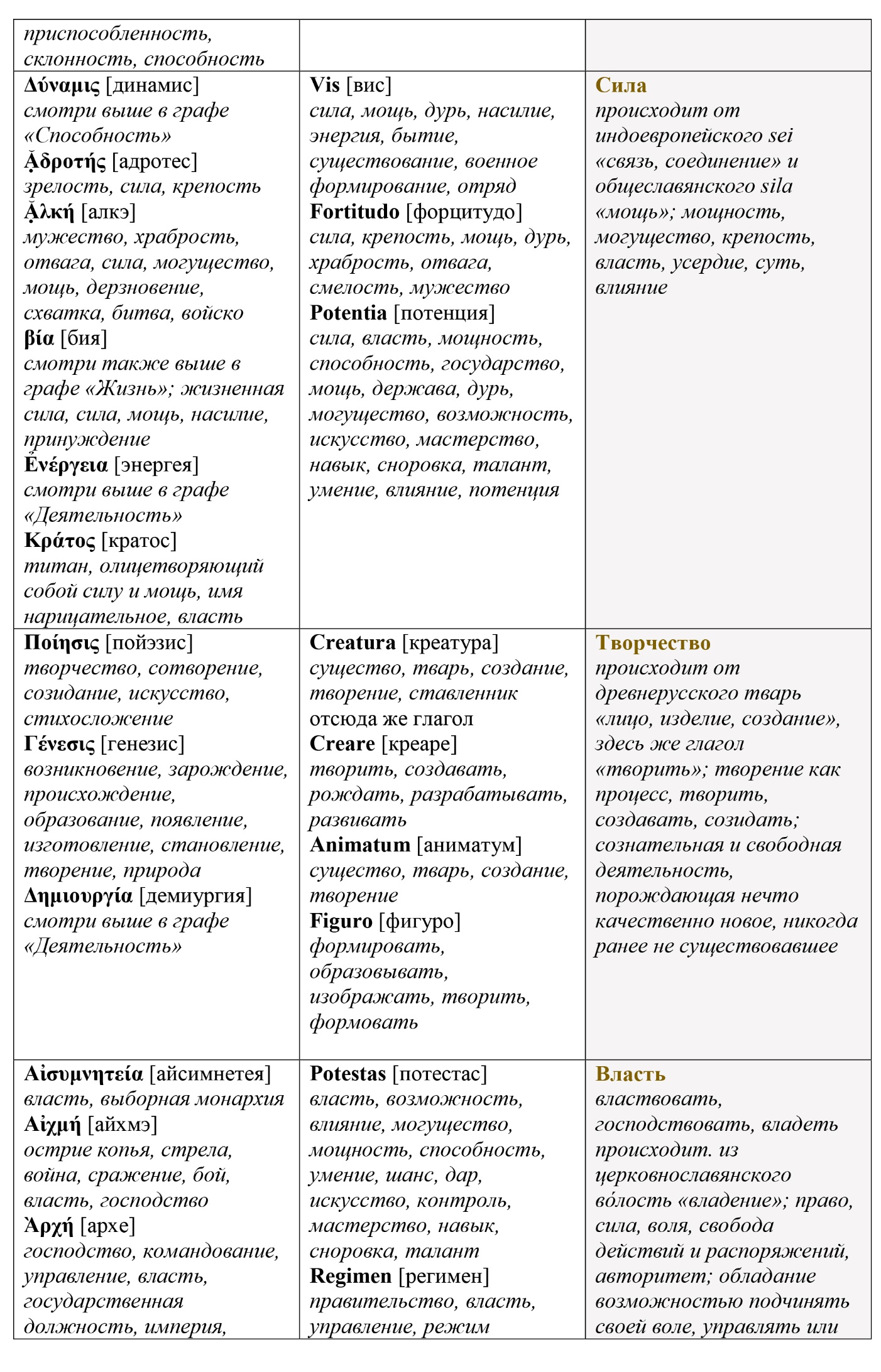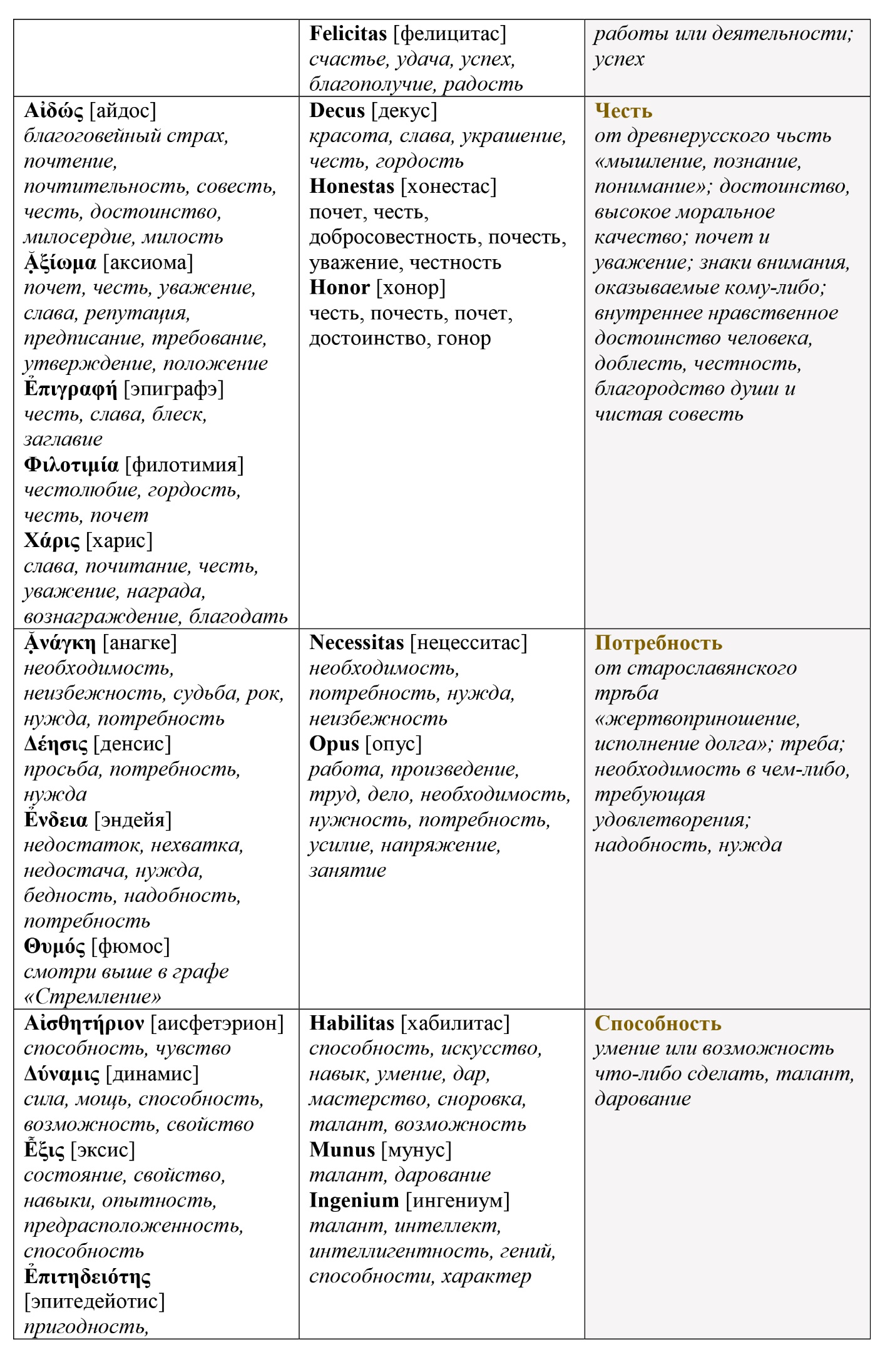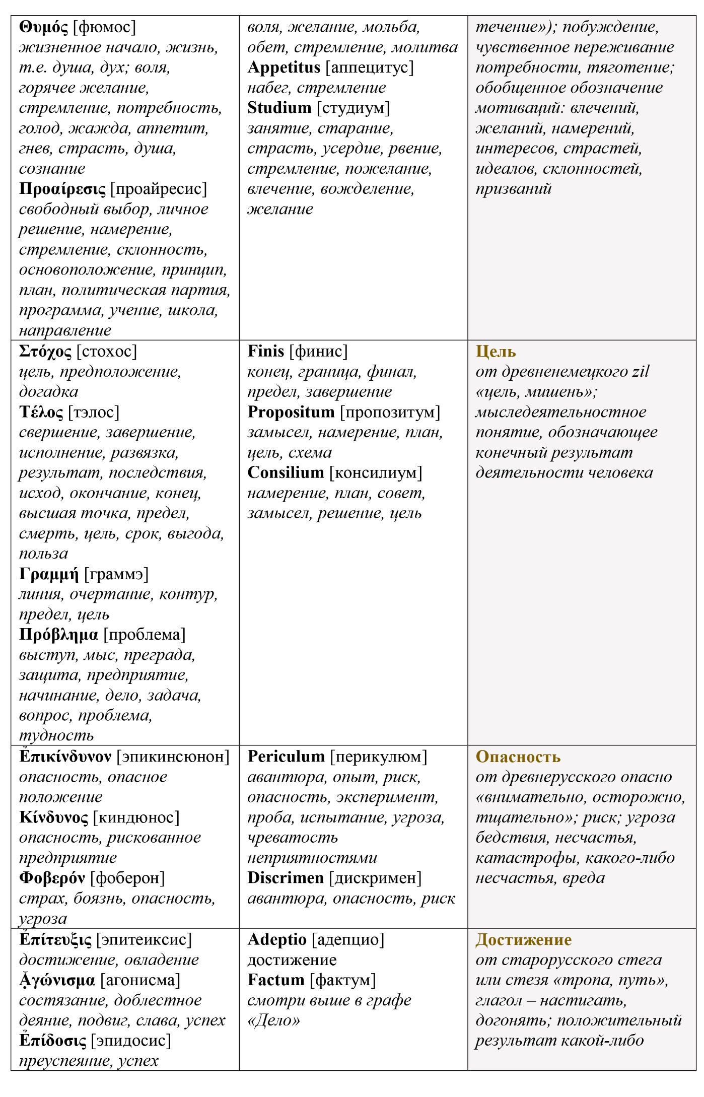 Оставим эту таблицу без комментариев, хотя даже при поверхностном рассмотрении видно, насколько сильно представленные понятия трансформировались за 2.5 тысячелетия развития цивилизации в сторону рафинирования человеческого эго и личностно-мыследеятельностного подхода. Например, цель как одна из важнейших характеристик свободной активности человека начала формироваться только в период завершения эпохи античности в lingua Latina. В древнегреческом языке цели как таковой – в ее современном понимании, – по-видимому, не существовало. Индивидуальные цели скорее всего замещались задачами, поставленными деятелю кем-то авторитетным извне. И только правители и герои могли позволить себе такую роскошь – быть целеустремленными. Но это не значит, что древние греки не ведали свободы. Их свобода в отличие от римлян и более поздних молодых варваров была бездеятельностной.