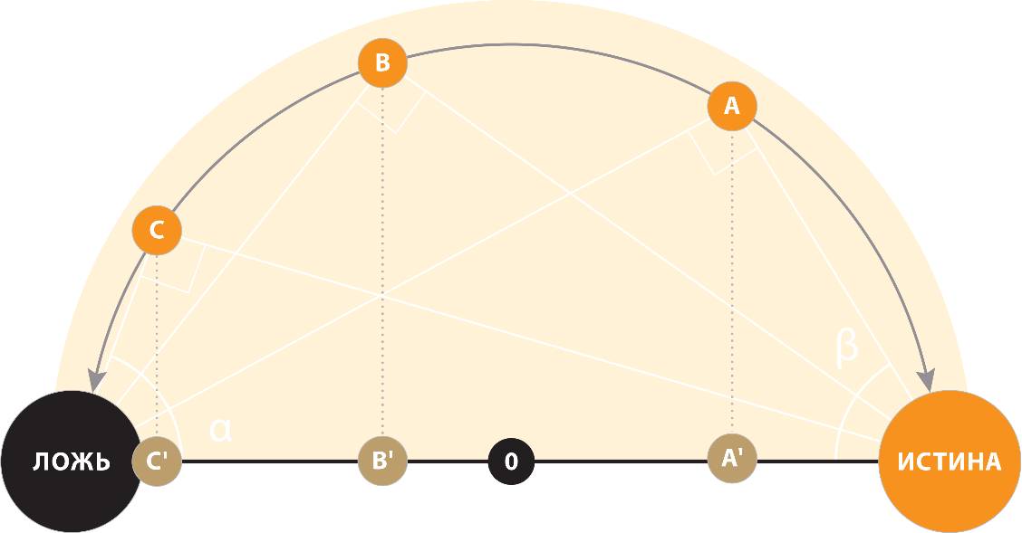 Если соединить точки Истины и Лжи с точкой А, а затем с В, а затем с С, мы получим три прямоугольных треугольника. Угол α по мере приближения соответствующей монады к полюсу Лжи стремиться стать прямым (900). Угол β – наоборот, стремится выклиниться, постепенно уменьшаясь до 00, но никогда таковым не становясь ввиду пресловутой бесконечности всей конструкции.